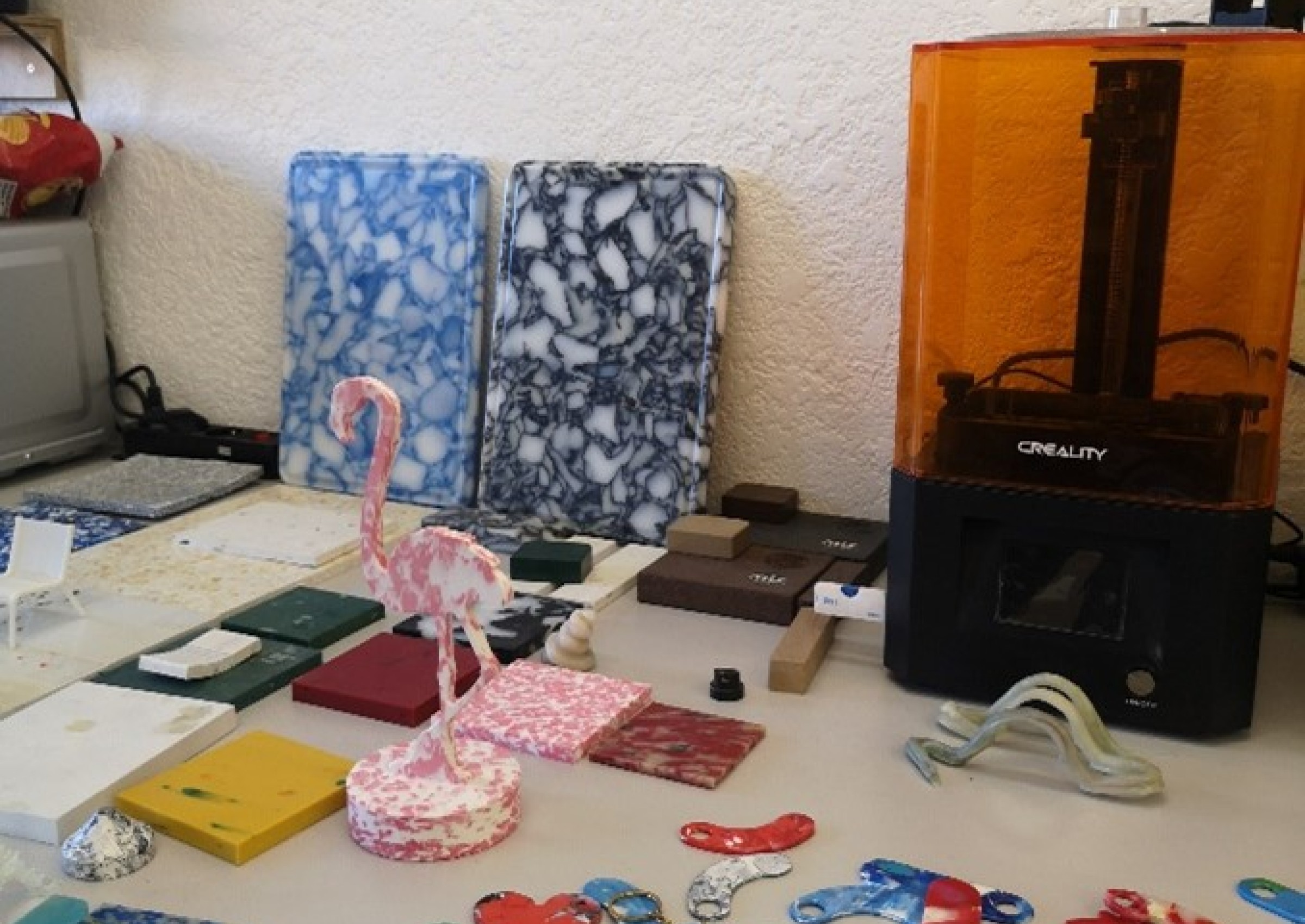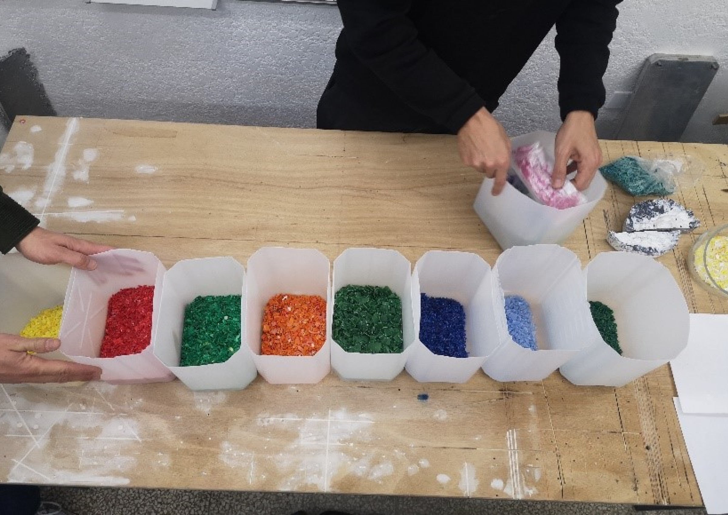 Les déchets sont triés, fondus, pressés en plaques de plastique pour ensuite être modelés un objet imaginé et évocateur pour le jeune.